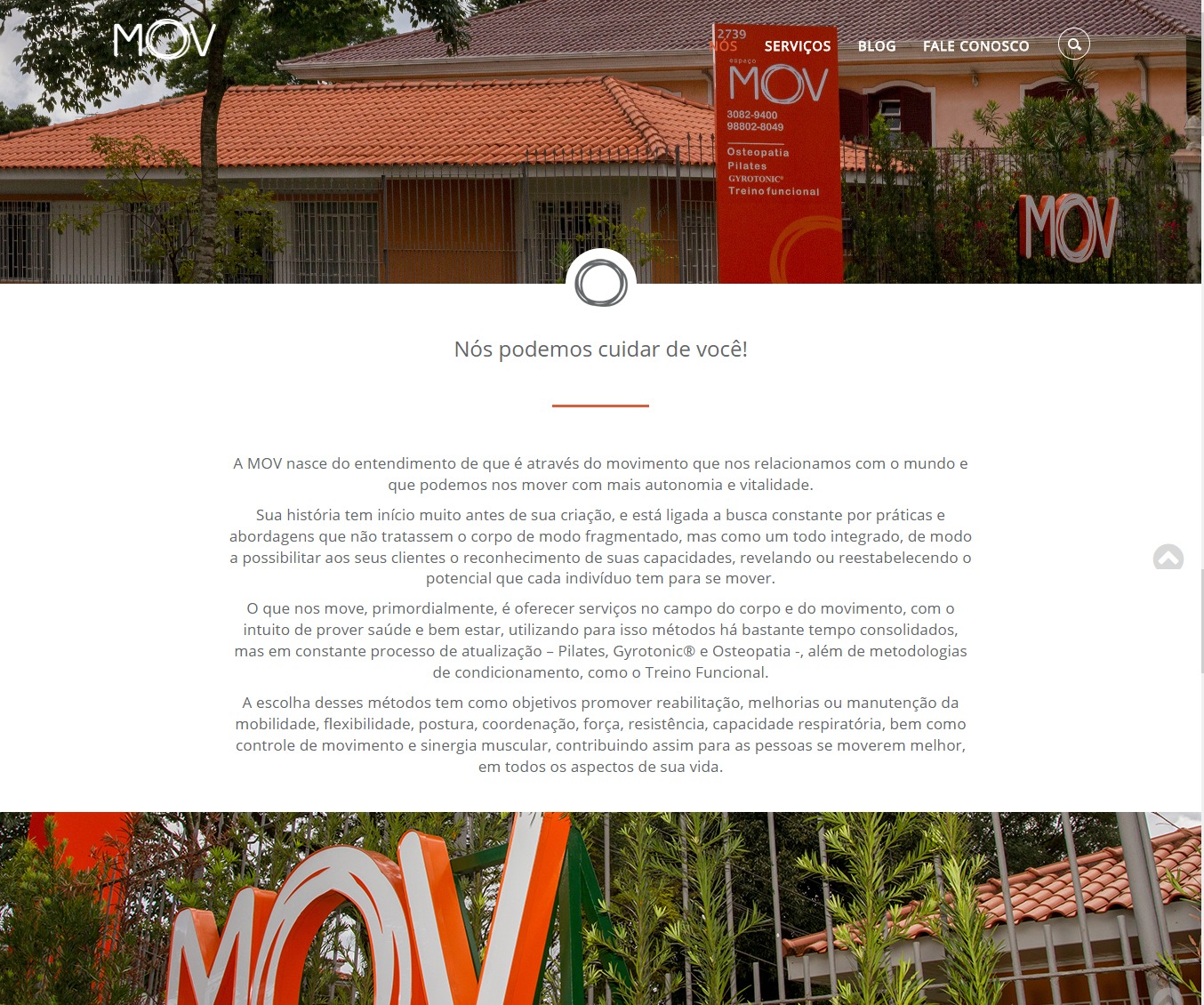 A Mov é uma academia que nasceu tendo como objetivo o desenvolvimento de atividades que envolvam o moviemento humano. Permitindo a seus pacientes e alunos obterem e/ou recuperarem a saude fisica ideal para a manutenção e uma vida saldavel e prazerosa.